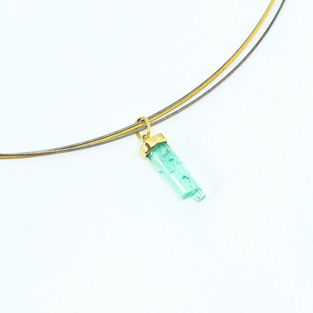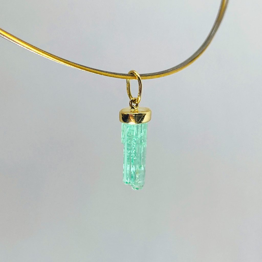 Einzigartiger Anhänger mit einem naturbelassenen Smaragd Canutillo aus Kolumbien. Der außergewöhnlich reine Smaragd besticht durch seine längliche Kristallform und das erfrischende Apfelgrün. In feiner Handarbeit wurde der hochwertige Kristall in 750er Gelbgold eingefasst, das mit einer glänzend polierten Oberfläche dem Stein einen stilvollen Rahmen verleiht. Dieses Schmuckstück vereint die Faszination der Natur mit klassischer Eleganz und ist ein besonderes Highlight für Liebhaber außergewöhnlicher Edelsteine.