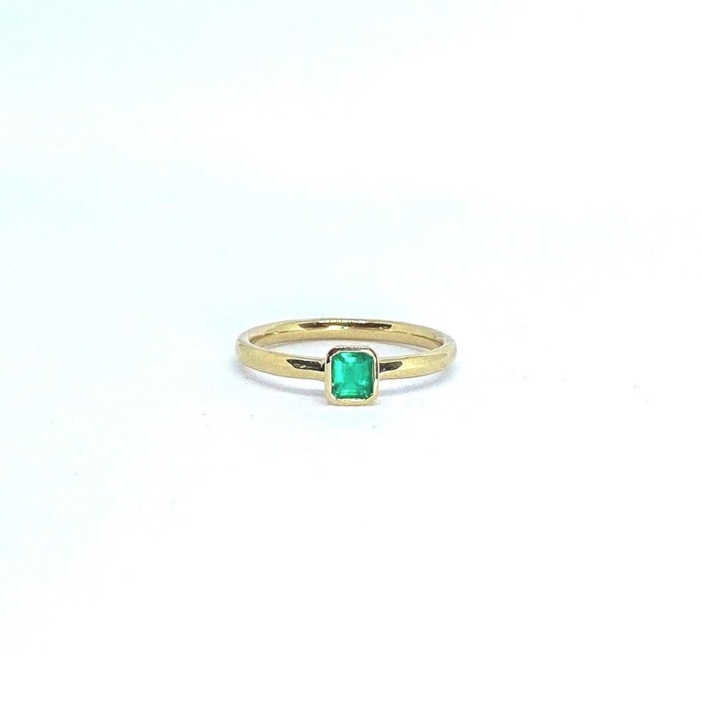 Smaragd-Ring aus 750 Gold. Im Zentrum des Designs steht ein intensiv grüner Smaragd aus Kolumbien, dessen sanft, polierte Oberfläche die natürliche Schönheit und Tiefe des Edelsteins besonders zur Geltung bringt. Die feine Goldfassung hebt den Smaragd elegant hervor.
