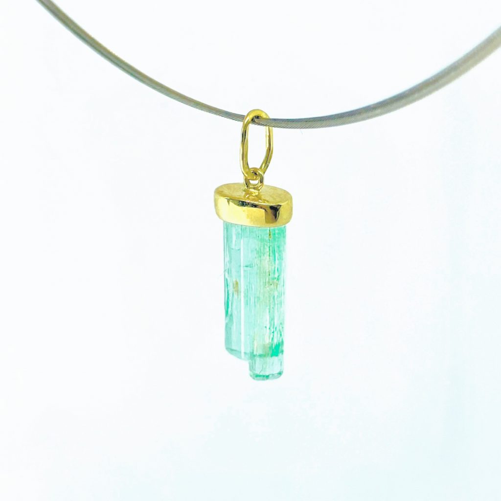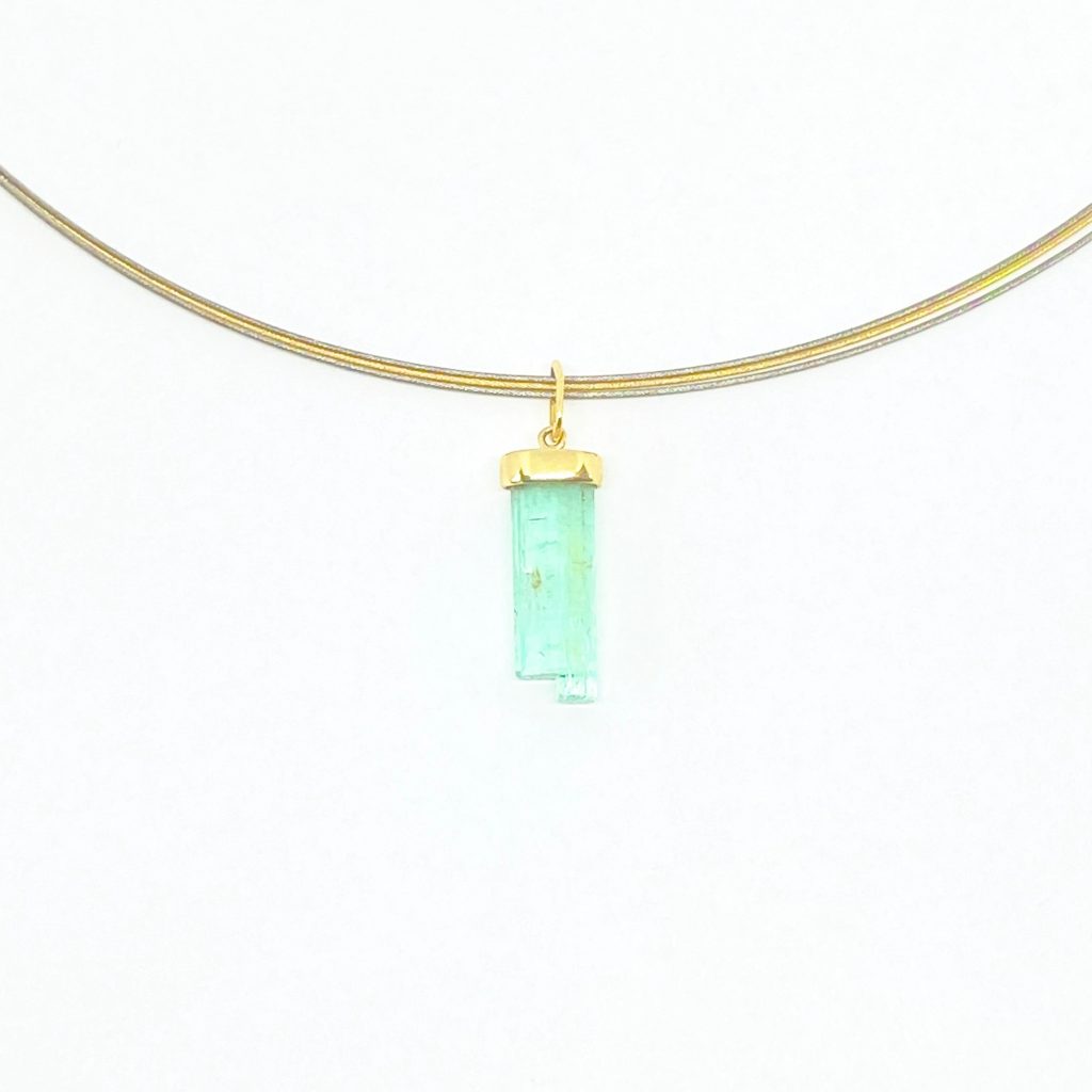 Einzigartiger Anhänger mit einem naturbelassenen Smaragd Canutillo aus Kolumbien. Der außergewöhnlich reine Smaragd besticht durch seine längliche Kristallform und das erfrischende grün. In feiner Handarbeit wurde der hochwertige Kristall in 750er Gelbgold eingefasst, das mit einer glänzend polierten Oberfläche dem Stein einen stilvollen Rahmen verleiht. Dieses Schmuckstück vereint die Faszination der Natur mit klassischer Eleganz und ist ein besonderes Highlight für Liebhaber außergewöhnlicher Edelsteine.